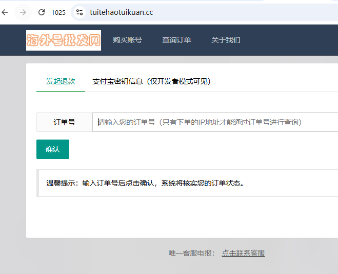 输入订单号并点击确认即可发起退款,注意只有下单ip才能发起退款